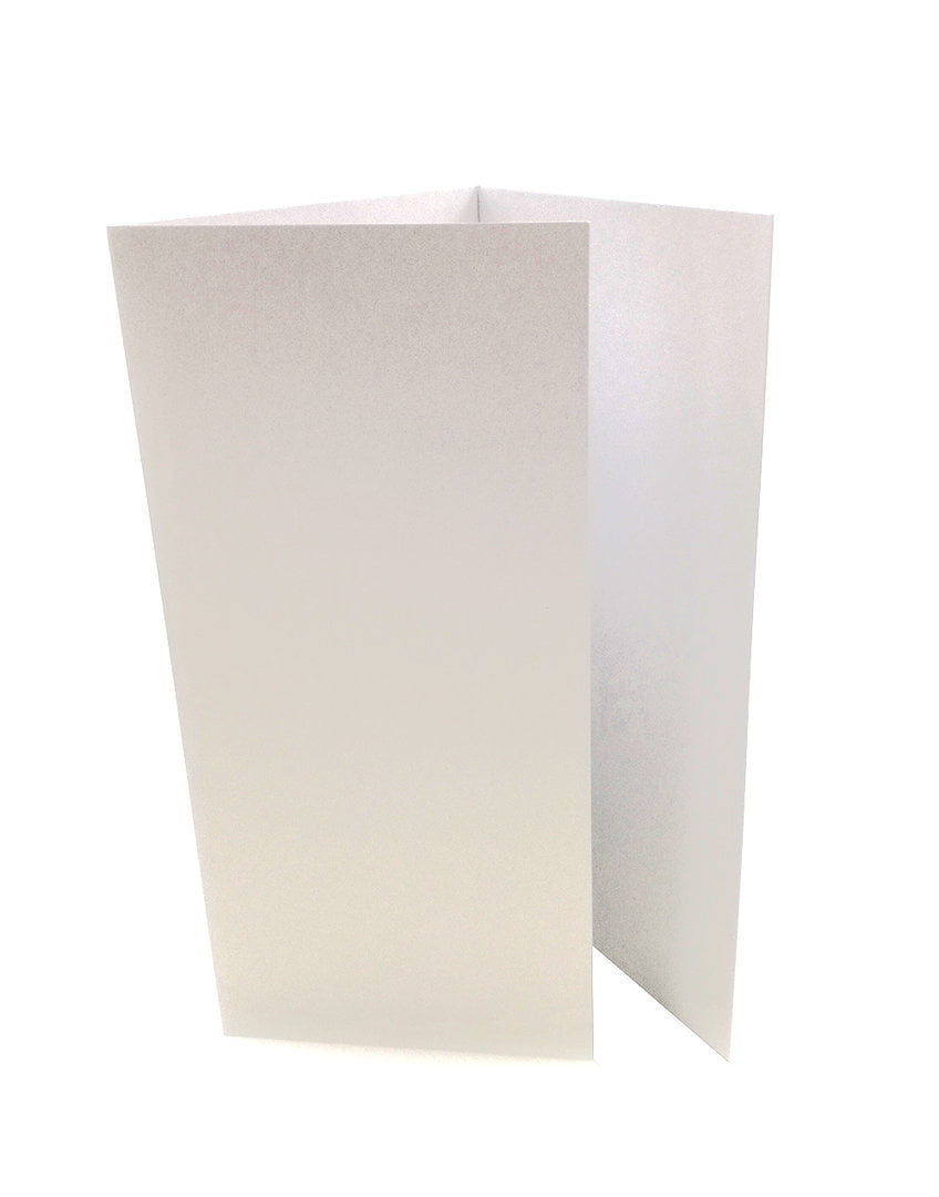 3-osainen pitkä korttipohja. Soveltuu hyvin esimerkiksi menu-/ohjelmakylteiksi juhlapöytiin. Pakkaus sisältää 5kpl helmiäisvalkoista korttipohjaa.