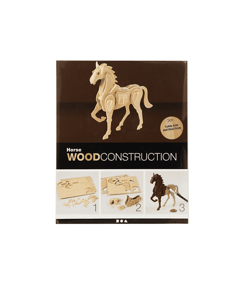 Puinen koottava 3D-palapeli. Mukana tulee ohjeet. Hevosen koko 18×4,5×16 cm. Voit maalata valmiin hevosen esimerkiksi akryyliväreillä.