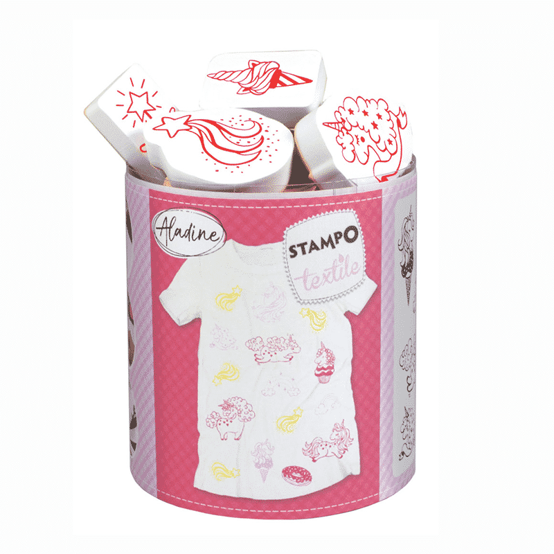 Ihana tekstiilileimasinsetti, jossa kuvina yksisarvisia ja herkkuja. Pakkaus sisältää yhteensä 14 leimasinta ja yhden mustan musteen. Muste sopii luonnonmateriaaleille, kuten puuvillalle ja silkille. Kuivumisaika 5-15 minuuttia. Silityskiinnityksen jälkeen tekstiili kestää 40 asteen pesun. Voit halutessasi värittää leimaamasi kuvat tekstiilitusseilla.