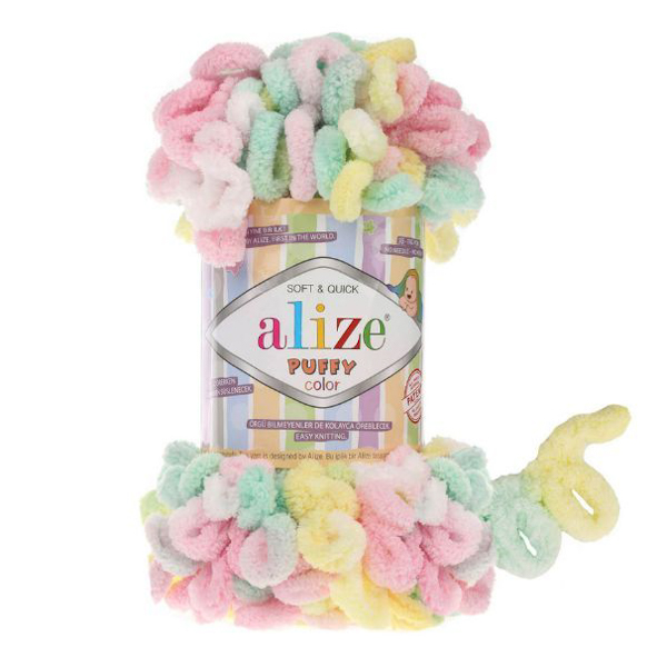 Alize Puffy Color on ihanan muhkea ja lumoavan pehmeä neulelanka, jossa on valmiit lenkit. Lankaa työstetään sormilla, eikä puikkoja tai koukkuja tarvita. Tämä tekniikka sopii kaikenikäisille. Lanka on moniväristä, joten saat kauniin kirjavan lopputuloksen yhdellä langalla. Langasta voi valmistaa ihanan pehmeitä vaunupeittoja, huiveja ja muita asusteita.