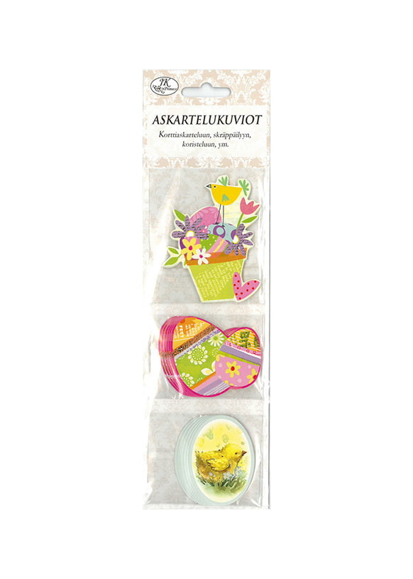 Ihanat askartelukuviot tipuilla ja pääsiäismunilla. Sopivat korttiaskarteluun, skräppäilyyn tai vaikka kodin koristamiseen! Kuvioissa kimalle-yksityiskohtia. Jokaista kuviota 6 kpl, yhteensä 18 kpl.