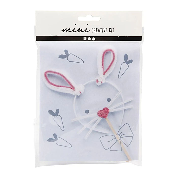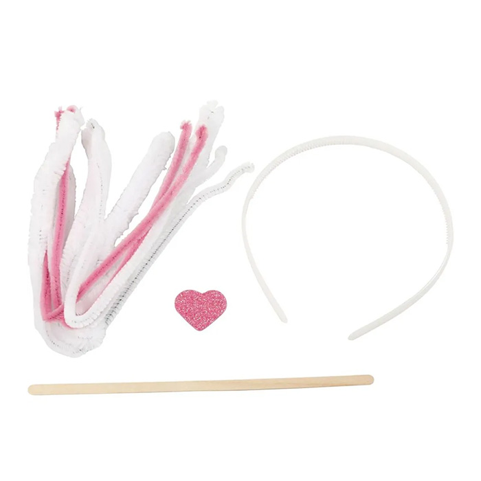 Askartelusetti, jossa tarvikkeet hauskan pupu hiuspannan tekoon.  Pakkaus sisältää muovisen hiuspannan, askartelupunoksia, puutikun ja softista. Ohjeet tulevat pakkauksen mukana.