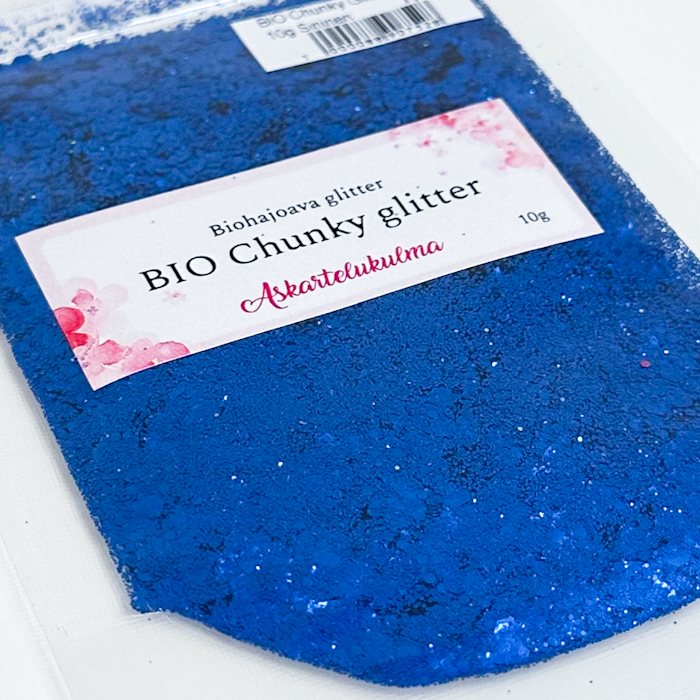 Uudet BIO Chunky glitterit erilaisiin askarteluihin tai vaikkapa hartsikorujen tekoon! BIO Chunky glitter on yhdistelmä eri kokoisia kimaltavia glitter-hileitä, jotka tekevät glitteristä upean eläväisen näköisen. BIO glitterit ovat biohajoavia, eivätkä sisällä mikromuovia. Glitterit on valmistettu eucalyptus-puiden selluloosasta ja ne on pakattu kätevään uudelleen lukittavaan pakkaukseen. Pakkauskoko 10g.