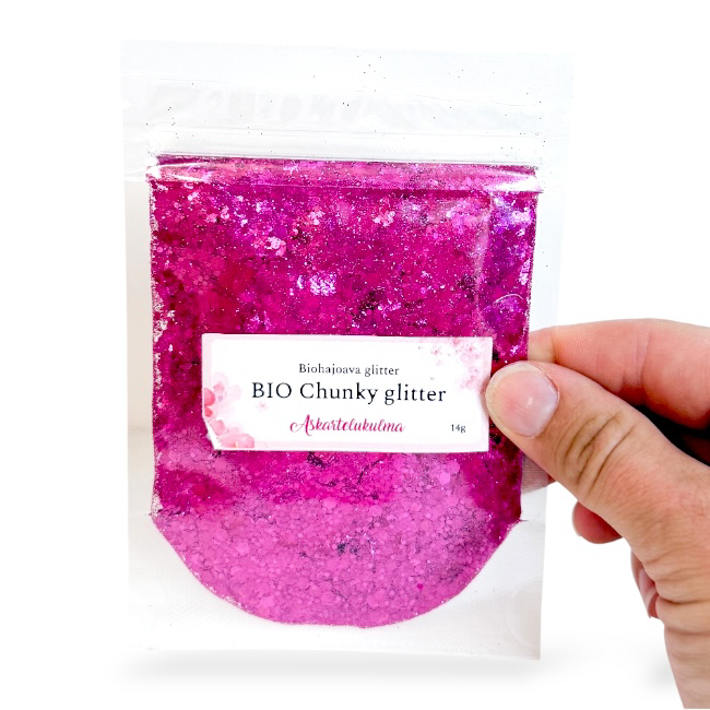 Chunky Glitter sisältää kolmea erikokoista glitterhilettä: 1/128, 1/24 ja 1/10. Pakkauskoko 14g.