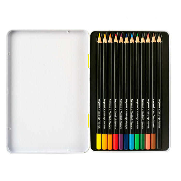 Bruynzeelin laadukas Van Gogh Museum värikynäsetti  upeassa peltirasiassa. Bruynzeelin värikynät on valmistettu korkealaatuisista pigmenteistä, jonka ansiosta kynillä saa kauniita värejä ja niitä on helppo sekoittaa keskenään. Kynissä on 2,9mm paksuinen väriydin, joka ei rikkoonnu helposti. Setissä on 12 väriä.