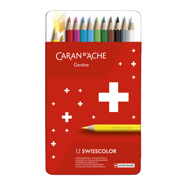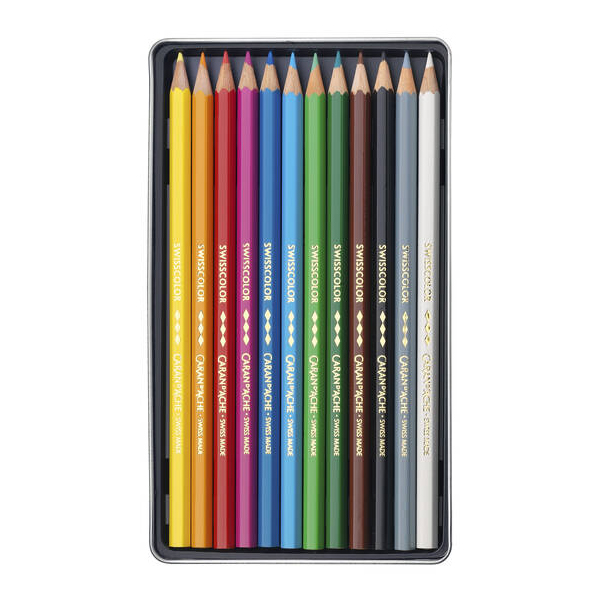 Caran d’Ache Swisscolor värikynät ovat laadukkaat ja voimakaspigmenttiset puuvärikynät, joissa on pehmeä, mutta katkeilematon lyijy. Lyijyn vahvuus 2,8mm. Metallirasia, jossa 12 väriä.