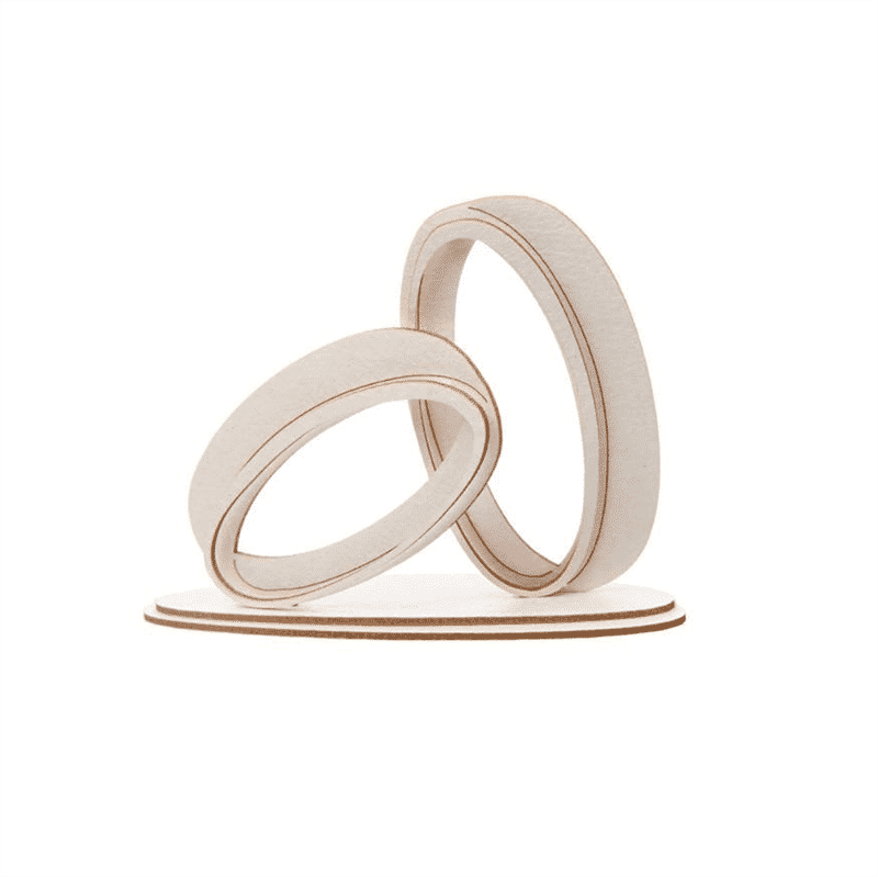 Chipboard- leikekuvat 3D sormukset. Upea koriste esimerkiksi hääkakkuun, pöytäkoristeeksi tai pakettikoristeeksi. Kuviot ovat nätit sellaisenaan, tai halutessaan ne voi maalata ja koristella mieleisekseen. Kuviot ovat valmiiksi leikatut, mutta tarvittaessa voi käyttää terävää askarteluveistä apuna irroitukseen.