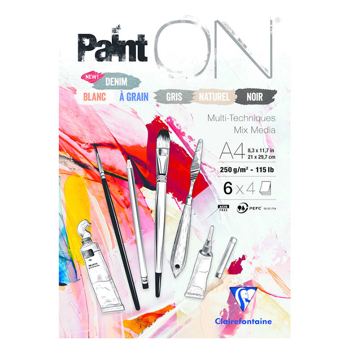 Clairefontaine Paint’ON Pad Mixed Media on erittäin suosittu ja monipuolinen taidelehtiö, joka on suunniteltu nimensä mukaisesti kestämään erilaisia tekniikoita (Mixed Media) Lehtiössä on kuusi eri sävyistä paperia, yhteensä 24 arkkia. Paperin vahvuus on 250g ja se on happovapaata, sekä PEFC- sertifioitua. Lehtiön koko on A4 eli 21x 29,7cm.