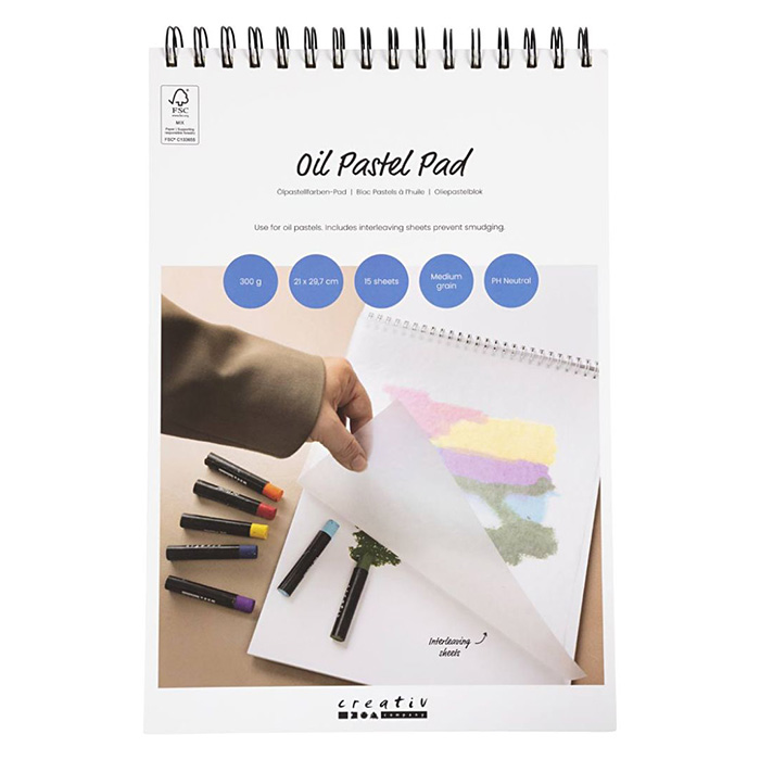 Creativ Companyn A4-kokoinen kierrepaperilehtiö öljypastelliväreille. Lehtiössä on suojapaperiarkit sivujen välissä, jotta taideteokset säilyttävät värinsä. Lehtiössä on 300g vahvuista valkoista paperia, jossa on tekstuuri pinta. Paperi on happovapaata ja PH-neutraalia. Lehtiön koko on 21×29,7cm ja siinä on 15 arkkia.