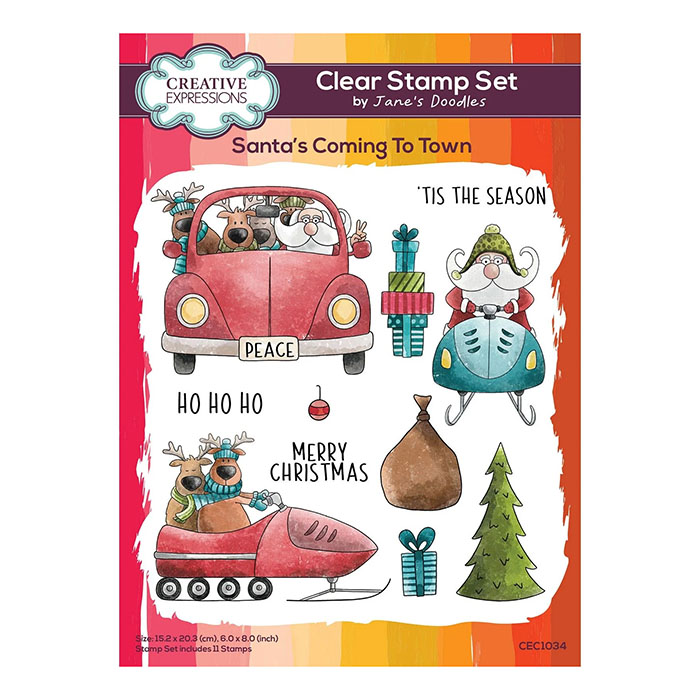 Hauska jouluinen leimasinsetti, jossa yhteensä 11 erilaista kirkasta leimasinta. Arkin koko on 15,2 x 20,3cm. Leimasimet asetetaan akryylipalaan leimatessa.