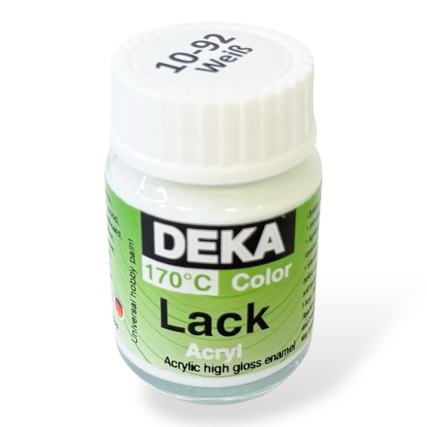 Deka Lack on vesipohjainen ja kuultava askartelumaali monenlaisille pinnoille, kuten esimerkiksi puulle, massalle, kivelle, styroxille, kipsille, pahville, paperimassalle, lasille, metallille jne.