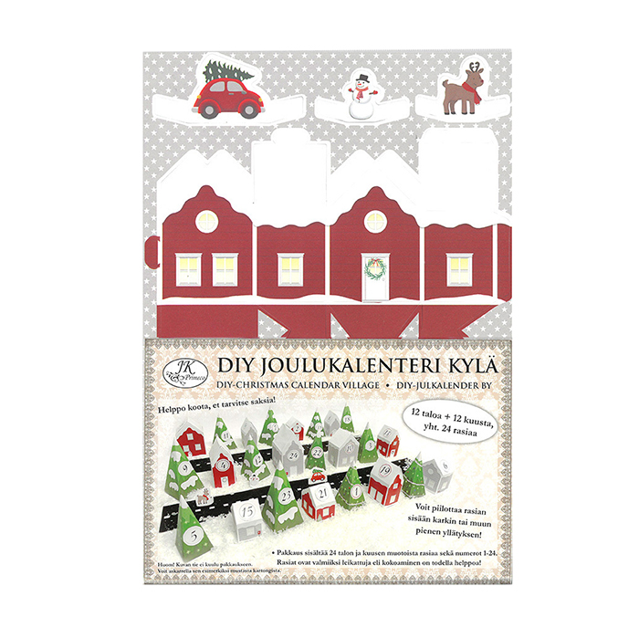 DIY-joulukalenteri, jossa rakennetaan joulukalenteri kylä pienistä kasattavista kartonkitaloista. Voit piilottaa haluamiasi pikku yllätyksiä talojen sisään ja asetella kylän esimerkiksi hyllylle koristeeksi. Pakkaus sisältää valmiiksi leikatut talon ja kuusen malliset rasiat kylän askarteluun sekä numerot 1-24 rasioiden numeroimiseen. Valmiista pakkauksesta tulee 12 taloa ja 12 kuusta. Rasiat on helppo koota, etkä tarvitse kokoamiseen kiinnitystarvikkeita. Tarvitset vain liimaa tai kaksipuoleista teippiä numeroiden kiinnittämiseen. Valmiiden talojen korkeus n. 6,5-12cm ja kuusien korkeus n. 10-13cm.
