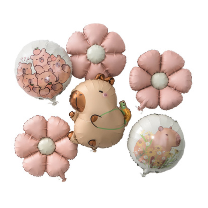 Hauska foliopallosetti esimerkiksi lasten juhliin. Setissä 6 foliopalloa, jotka voi täyttää heliumilla tai pillin kanssa ilmalla. Isoimman pallon koko 51 × 63.5cm, kukan muotoisten pallojen halkaisijat 60cm ja pyöreiden pallojen halkaisijat 45cm.