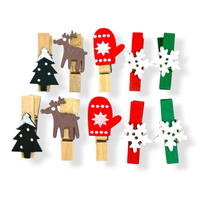 Puiset pyykkipojat, joissa hauskat jouluaiheiset kuviot. Ihanat vaikka joulukalenterin askarteluun tai joulukorttien ripustukseen. Pyykkipoikien korkeus noin 3,5cm. Pakkauksessa 10kpl.