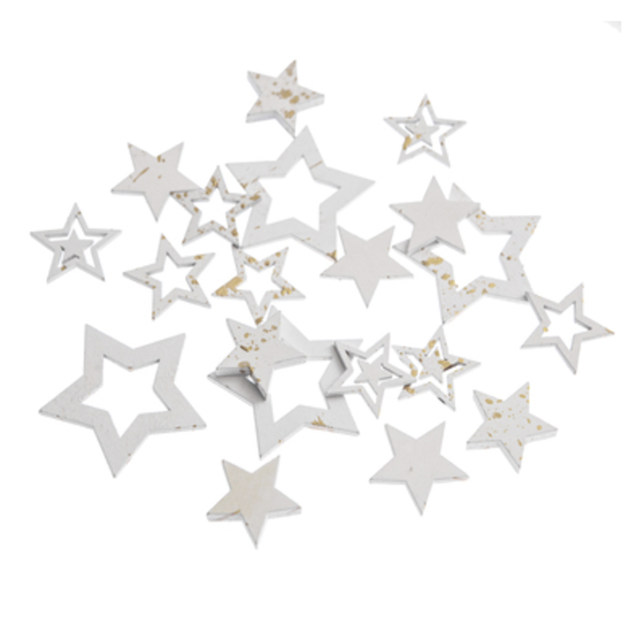Valkoiset puiset tähtikoristeet, joissa hieman kultaisia roiskeita. Pakkauksessa isompia ja pienempiä tähtiä, yhteensä 20 kpl. Pienimmän tähden koko noin 2,5cm ja isoimman noin 5cm.