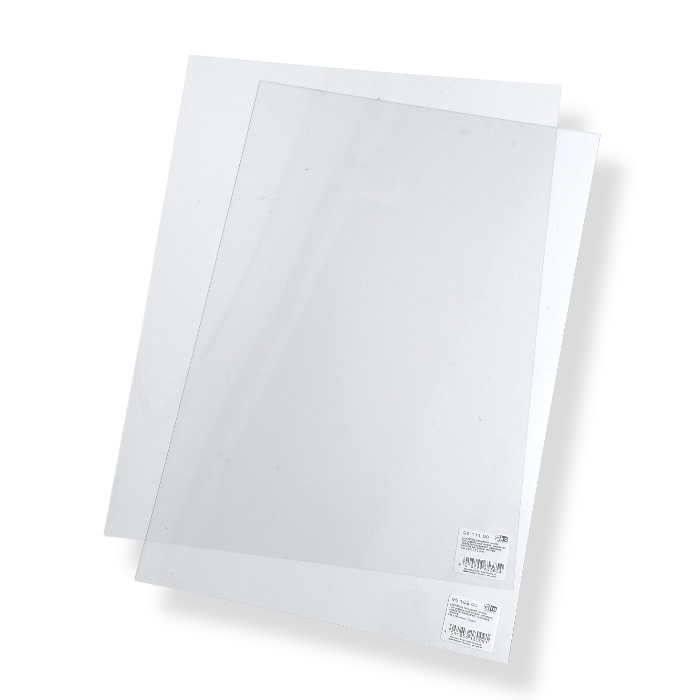 Kirkas muovikalvo, jonka koko on 30×44,5cm ja paksuus 0,5mm.