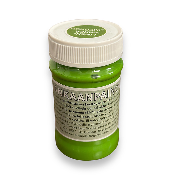 EMO kankaanpainoväri on valmis kankaanpainoväri vaaleille luonnonkuitukankaille. Värejä voidaan sekoittaa keskenään uusien sävyjen saamiseksi. Värin kiinnitys kankaaseen silittämällä värin kuivuttua.