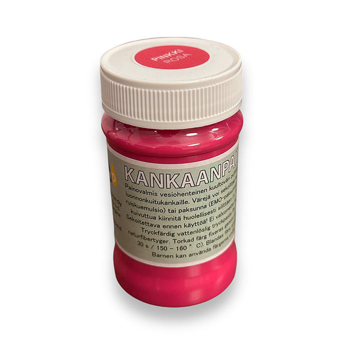 EMO kankaanpainoväri on valmis kankaanpainoväri vaaleille luonnonkuitukankaille. Värejä voidaan sekoittaa keskenään uusien sävyjen saamiseksi. Värin kiinnitys kankaaseen silittämällä värin kuivuttua.