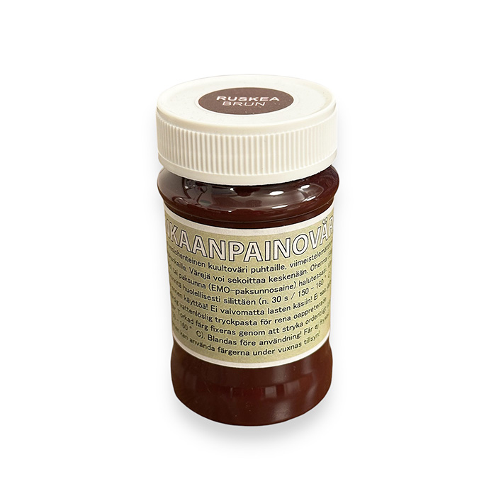 EMO kankaanpainoväri on valmis kankaanpainoväri vaaleille luonnonkuitukankaille. Värejä voidaan sekoittaa keskenään uusien sävyjen saamiseksi. Värin kiinnitys kankaaseen silittämällä värin kuivuttua.