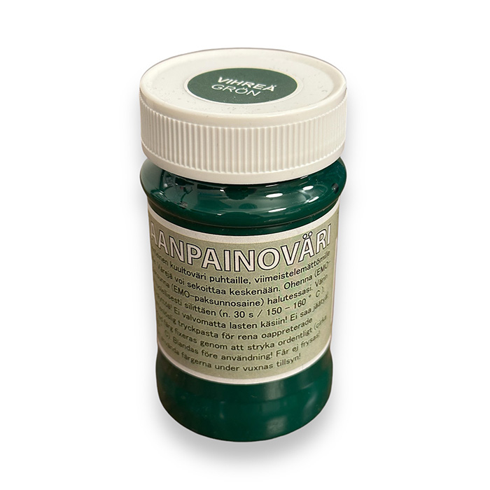 EMO kankaanpainoväri on valmis kankaanpainoväri vaaleille luonnonkuitukankaille. Värejä voidaan sekoittaa keskenään uusien sävyjen saamiseksi. Värin kiinnitys kankaaseen silittämällä värin kuivuttua.