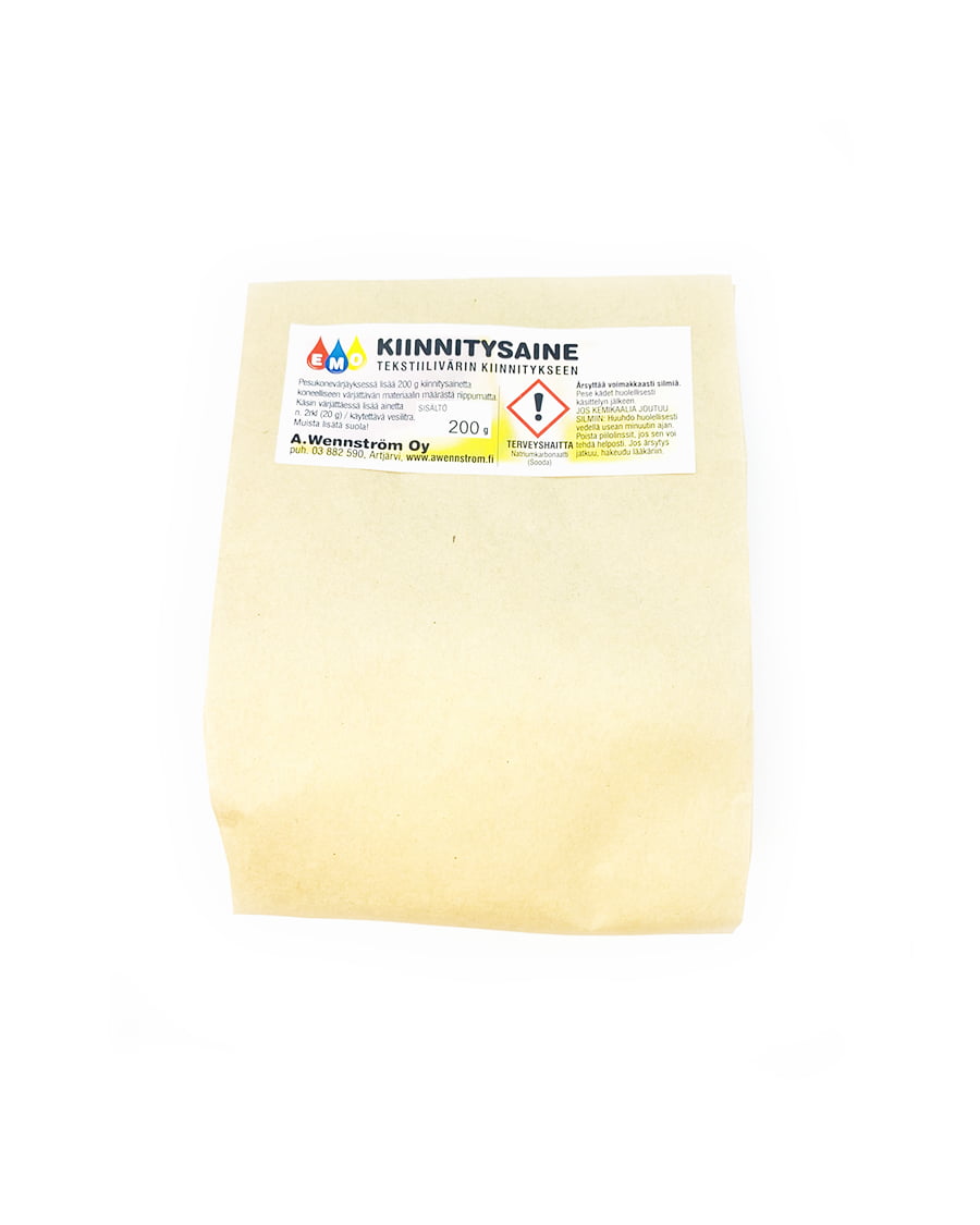 Emo tekstiilivärien kiinnitysaine. Pesukonevärjäyksessä lisätään 200g kiinnitysainetta koneelliseen värjättävän materiaalin määrästä riippumatta. Käsin värjätessä lisätään ainetta noin 2rkl (20g)/ käytettävä vesilitra. Muista lisätä suola!