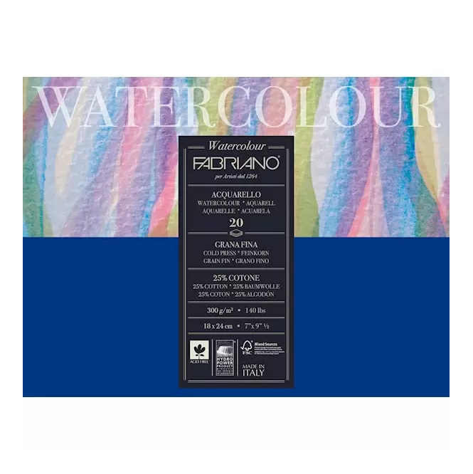 Fabrianon laadukas, mutta edullinen akvarellilehtiö, jossa on 300g/m2 vahvuinen paperi. Paperissa on 25% lumppua, se on happovapaata, ja valmisttu 100 % ECF-sellusta (Elemental Chlorine Free), FSC®-sertifioitu vastuullisesti hoidetuista metsistä, jotka noudattavat ympäristö-, sosiaalisia ja taloudellisia standardeja. Lehtiössä on 20 arkkia ja sivut on neljältä reunalta liimattu, joten paperi pysyy hyvin sileänä maalauksen ajan ja on helppo repäistä irti lehtiöstä maalauksen valmistuttua. Paperin karkeusluokka on Grana Fina eli puolikarkea. Lehtiön koko on 18x24cm.