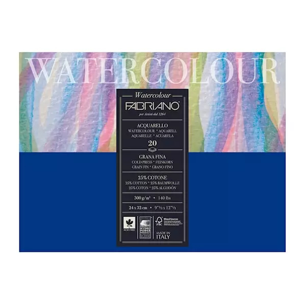 Fabrianon laadukas, mutta edullinen akvarellilehtiö, jossa on 300g/m2 vahvuinen paperi. Paperissa on 25% lumppua, se on happovapaata, ja valmisttu 100 % ECF-sellusta (Elemental Chlorine Free), FSC®-sertifioitu vastuullisesti hoidetuista metsistä, jotka noudattavat ympäristö-, sosiaalisia ja taloudellisia standardeja. Lehtiössä on 20 arkkia ja sivut on neljältä reunalta liimattu, joten paperi pysyy hyvin sileänä maalauksen ajan ja on helppo repäistä irti lehtiöstä maalauksen valmistuttua. Paperin karkeusluokka on Grana Fina eli puolikarkea. Lehtiön koko on 24x32cm.