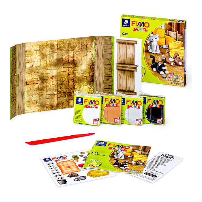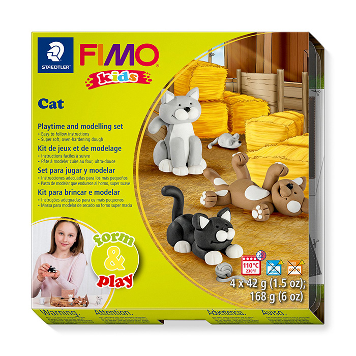 Fimo Kids Cat askartelusetti lapsille. Setti sisältää 4 eri väristä Fimo massaa (à 42g): 0 valkoinen, 71 vaaleanruskea, 80 vaaleanharmaa ja 9 musta. Mukana myös muotoilupuikko, lekkialusta, tarroja sekä ohjeet.