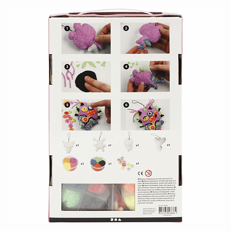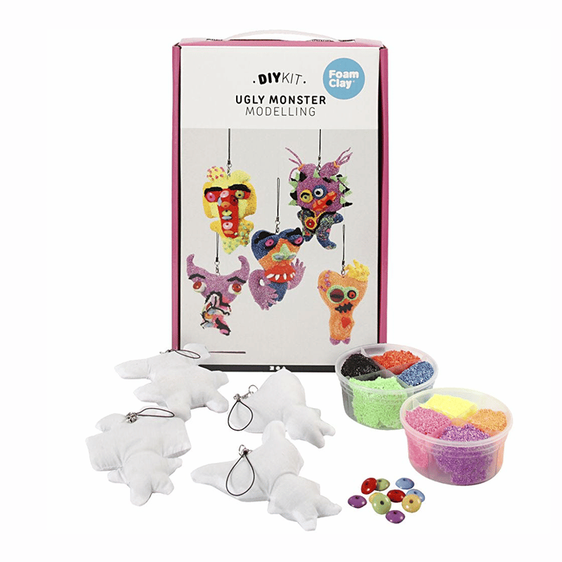 Hurjat Monsterit Foam Clay askartelupakkaus sisältää tarvikkeet 4 otukseen, jotka päällystetään helmimassalla. Mukana tulee 4 kangasotusta, 2×35 g helmimassaa, 10 muovihelmeä ja ohjeet .