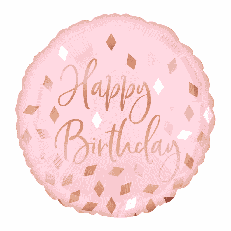 Pyöreä foliopallo Happy Birthday tekstillä. Pallon koko noin 43cm.