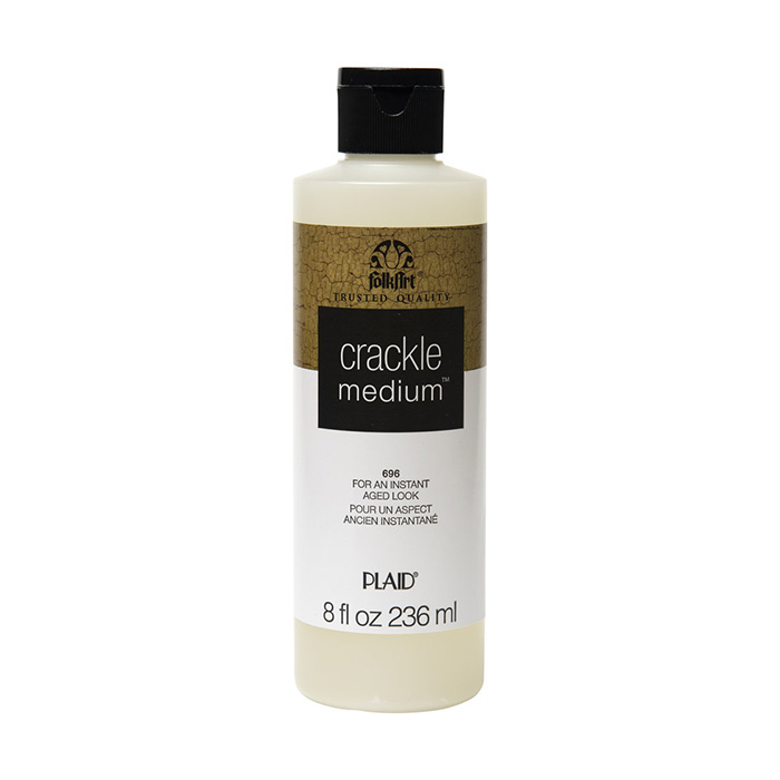 Crackle medium on vesiliukoinen lisäaine, jolla luot maalaamallesi työlle kulunutta ja halkeilevaa pintaa. Pohjamaalaa ensin pinta esimerkiksi FolkArtin akryylimaalilla. Valitse väri jonka haluat näkyvän halkeilun alta . Anna kuivua 1 tunti. Levitä seuraavaksi Crackle medium päälle. Anna kuivua jälleen 1 tunti ja maalaa sitten kontrastivärillä, joka erottuu pohjaväristä. Halkeilu alkaa näkyä läpi maalin kuivuttua.