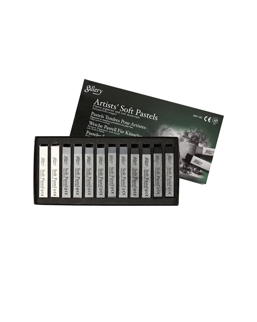 Gallery Artists’ Soft Pastels pastelliliitusetti, joka sisältää 12 värin lajitelman eri harmaan sävyisiä pehmeitä, pigmenttipitoisia pastelliliituja. Liidun koko 6,5 cm ja paksuus 10 mm.