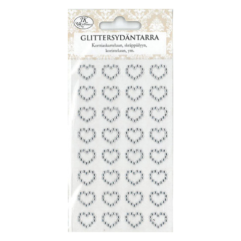Glittersydäntarrat esimerkiksi korttiaskarteluun ja muuhun koristeluun. Sydämen koko noin 1,1cm x 1,3cm. Pakkauksessa on 32 tarraa.