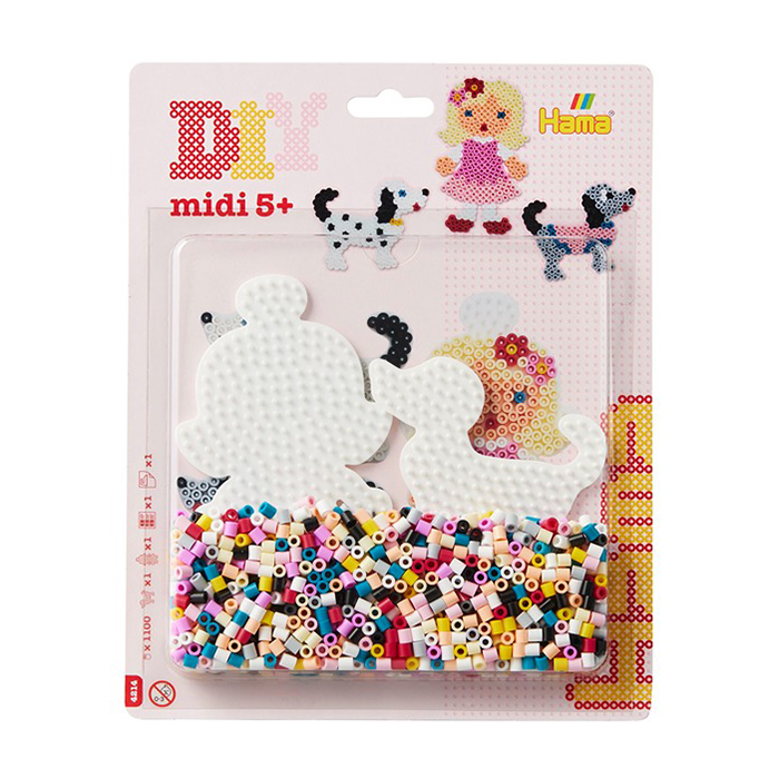 Hamahelmisetti, joka sisältää noin 1100kpl eri värisiä MIDI hamahelmiä, 2 erilaista silitysalustaa: koira ja nukke, sekä ohjeet ja silityspaperin.