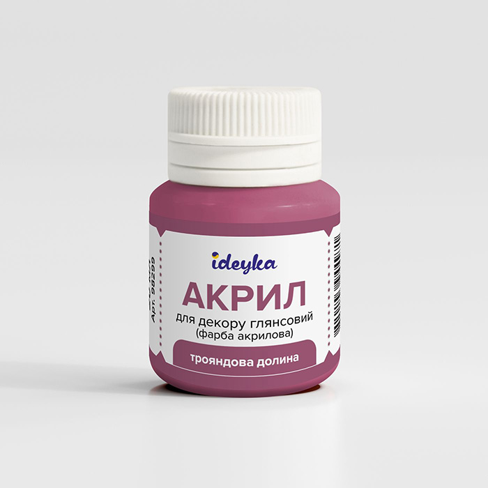 Ideykan akryylimaali on laadukasta Ukrainalaista askartelumaalia, joka sopii monille eri pinnoille, kuten esimerkiksi paperille, pahville, puulle, kivelle, muoville ja metallille. Maali on valmistettu korkealaatuisista pigmenteistä ja sen koostumus on kermaista ja juuri sopivan juoksevaa ilman lisäohennusta. Maali levittyy tasaisesti ja kuivuu nopeasti. Se on maalatessa vesiliukoista ja kuivuttuaan veden kestävää. Lisäkestoa maalipinnalle saa lisäämällä kuivumisen jälkeen lakan päälle. Purkkikoko 20ml.