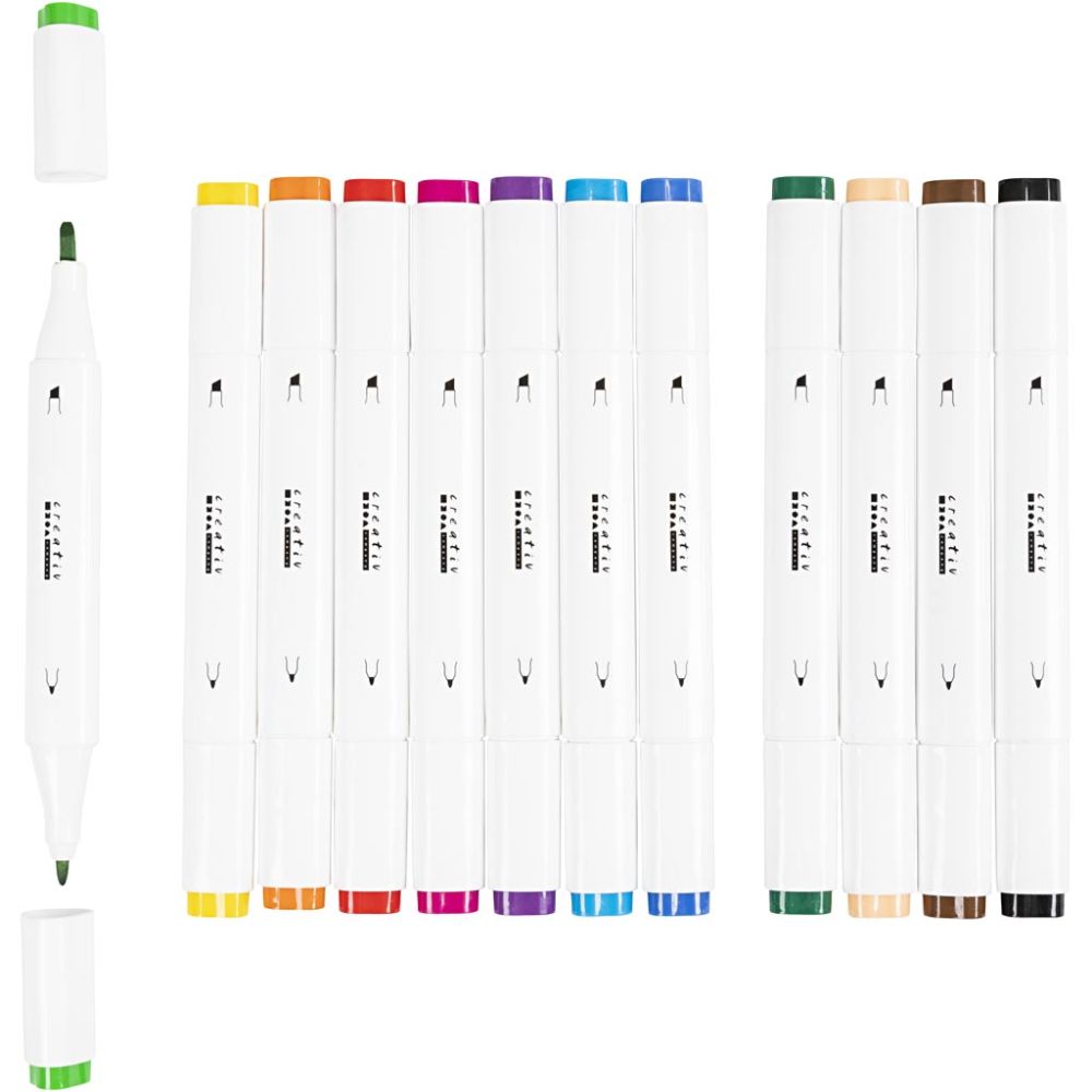 Kauniit ja eloisat värit peittävät täydellisesti jättämättä raitoja valkoiselle paperille. Tusseissa on kaksinkertainen kärki – neliönmuotoinen leveä kärki suurten alueiden värittämiseen, ja ohut kärki pienempien yksityiskohtien ja viivojen/kirjoituksen tekemiseen. Tussien värit ovat puoliksi läpinäkyviä, joten voit halutessasi tehdä vaaleita siirtymiä eri värien välillä (häivyttää). Jos rakastat kalligrafiatekniikoita, tussit sopivat myös siihen.