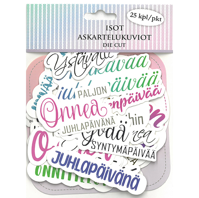 Isot askartelukuviot askarteluun, korttien tekoon ja muuhun koristeluun. Pakkaus sisältää 25 kappaletta erilaisia kartonkisia askartelukuvioita, joissa on kaunis foliopainatus.
