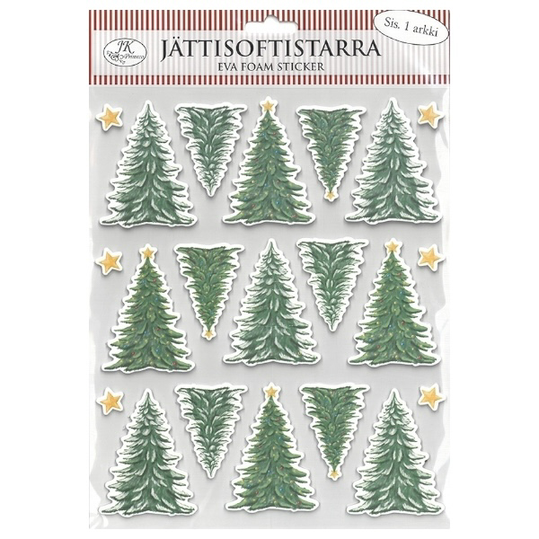Jättisoftistarrat esimerkiksi korttiaskarteluun ja muuhun koristeluun.  Isoimpien kuusien korkeus noin 7cm. Tarrojen paksuus 2mm. Pakkauksessa 1 arkki, jossa 15 kuusitarraa.