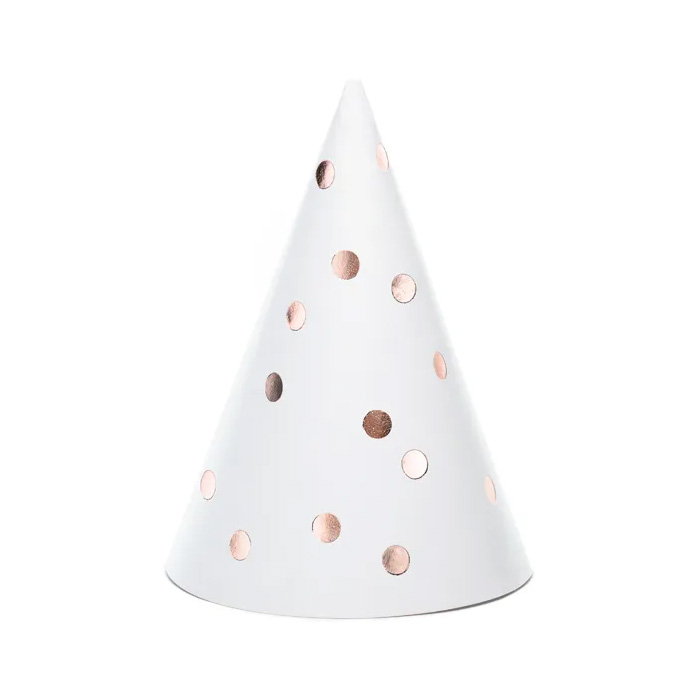 Pahvinen  pilkullinen juhlahattu, jonka korkeus on noin 16cm ja halkaisija noin 10cm. Pakkauksessa 6kpl.