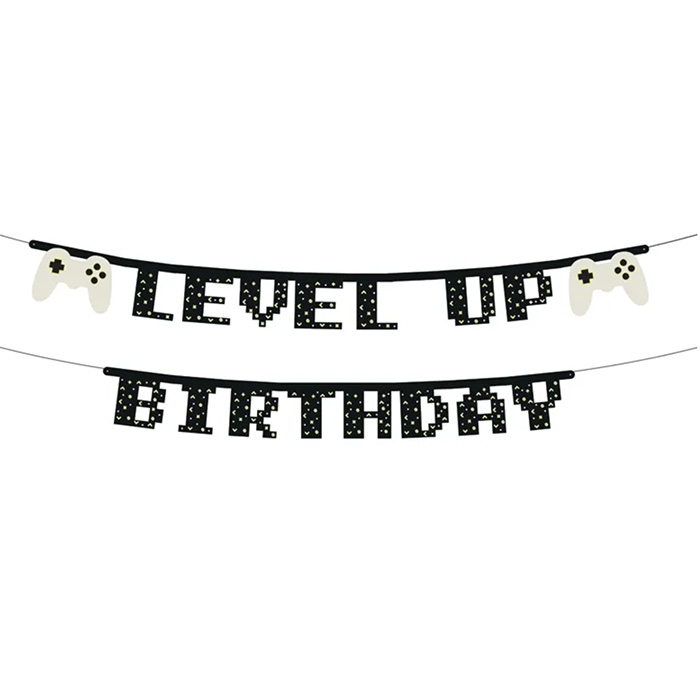 Hauska peliaiheinen juhlaviiri, jossa teksti Level Up Birthday. Viirin leveys 2,5 metriä. Kuvioiden korkeus noin 13cm.
