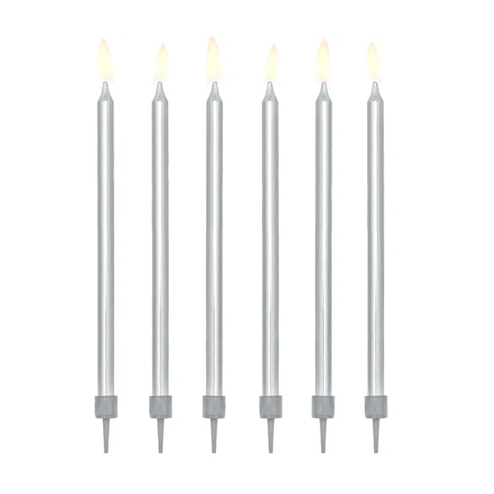Upeat hopeiset kynttilät syntymäpäiväkakkuun. Kynttilöiden pituus noin 12,5cm. Kynttilöiden muoviset pidikkeet tulevat mukana. Pakkauksessa 12 kynttilää ja pidikettä.