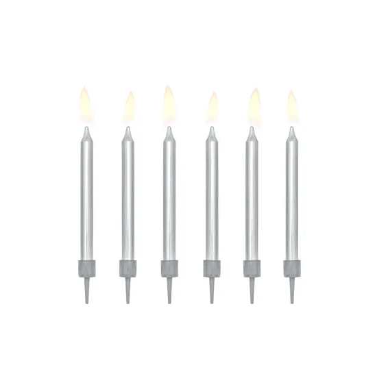Upeat hopeiset kynttilät syntymäpäiväkakkuun. Kynttilöiden pituus noin 6cm. Kynttilöiden muoviset pidikkeet tulevat mukana. Pakkauksessa 6 kynttilää ja pidikettä.