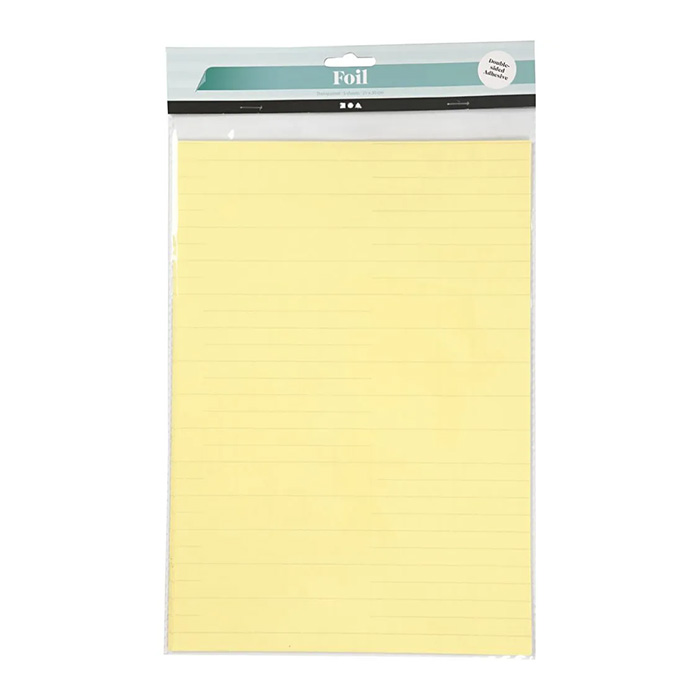 Kaksipuoleinen liimakalvoarkki, jonka koko on 21x30cm. Pakkauksessa 5 arkkia.