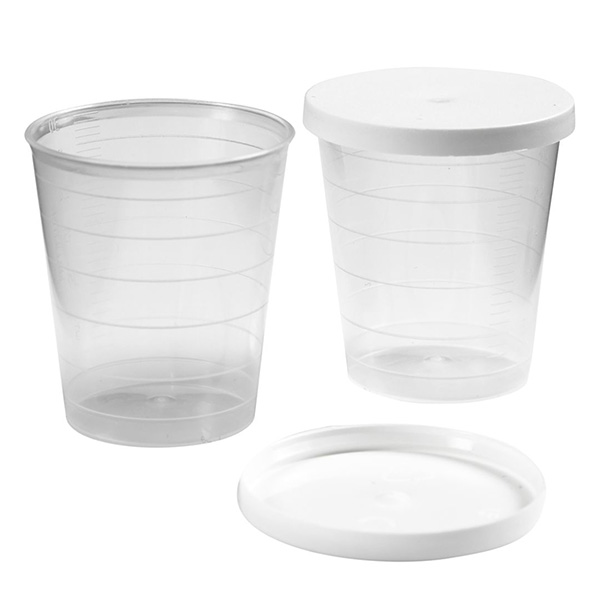 Muoviset pikkupurkit kansilla. Purkin korkeus ilman kantta on noin 4,3cm ja purkin tilavuus on 30ml. Pakkauksessa on 10kpl.