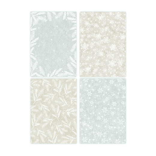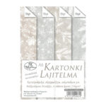 A6 kokoinen kartonkilajitelma esimerkiksi joulukorttiaskarteluun. Pakkauksessa 4 erilaista kuviollista kartonkia. Pakkauksessa yhteensä 20 arkkia. Kartongin vahvuus 230g.