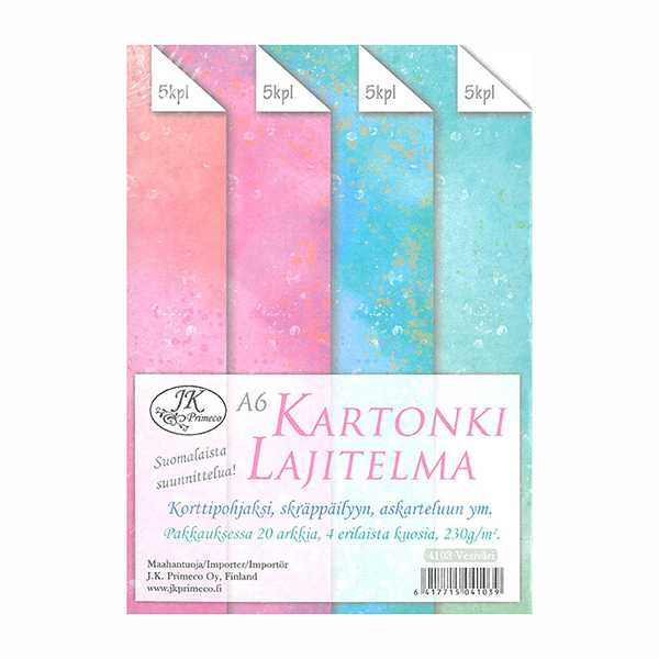 Kartonkilajitelma esimerkiksi korttiaskarteluun. Kartongin vahvuus on 230g, joten se sopii myös suoraan korttipohjaksi. Arkin koko  on 14,8 x 10,5cm. Pakkauksessa 20 arkkia, 4 erilaista kuosia.