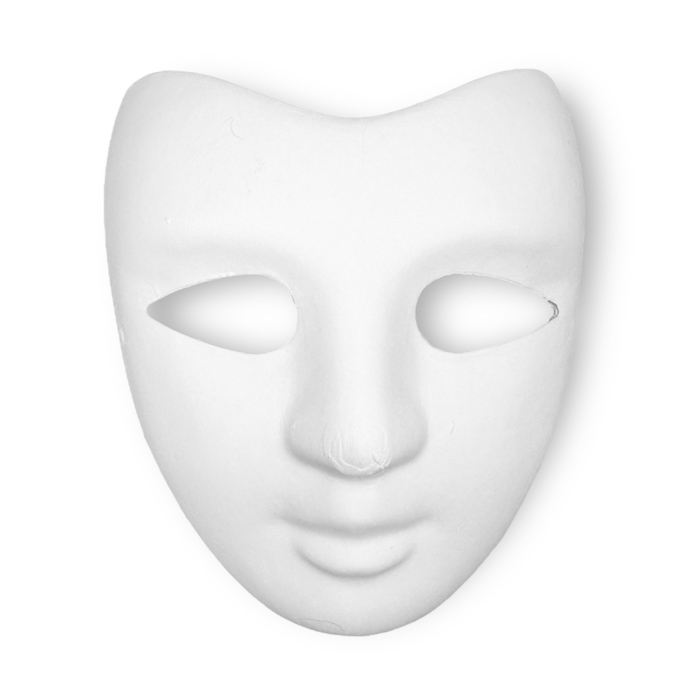Valkoinen naamiopohja, jonka koristelussa on vain taivas rajana! Voit maalata naamion esimerkiksi askartelumaaleilla tai -suihkeilla, muovata kevyillä muovailuvahoilla ja koristella esimerkiksi höyhenillä, kristalleilla ja muilla koristeilla.