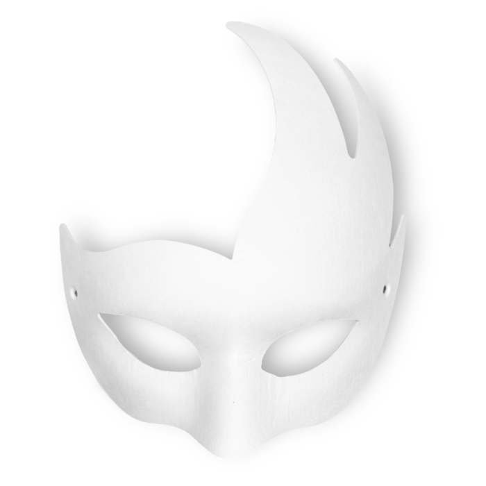 Valkoinen naamiopohja, jonka koristelussa on vain taivas rajana! Voit maalata naamion esimerkiksi askartelumaaleilla tai -suihkeilla, muovata kevyillä muovailuvahoilla ja koristella esimerkiksi höyhenillä, kristalleilla ja muilla koristeilla.