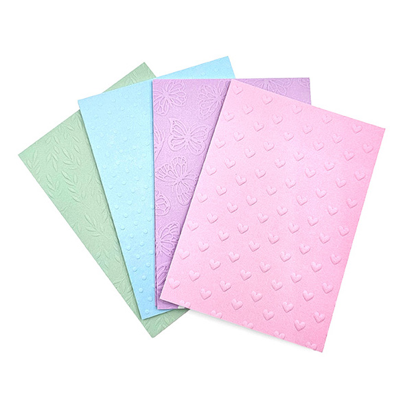 Kohokartonkilajitelma esimerkiksi korttiaskarteluun. Pakkauksessa on yhteensä 20 arkkia A6-kokoista kohokuvioitua kartonkia, 4 erilaista kuosia, 5 kpl kutakin. Kartongin vahvuus on 350g/m².