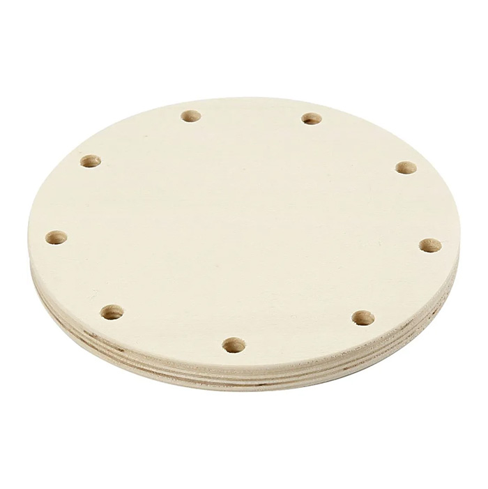 Puinen pyöreä korinpohjalevy, johon voi punoa eri materiaaleilla reunoilla olevia reikiä hyödyntäen. Levyn halkaisija on 12cm ja paksuus 9mm. Levyn reunassa on yhteensä 9 reikää, joiden halkaisija noin 6mm.